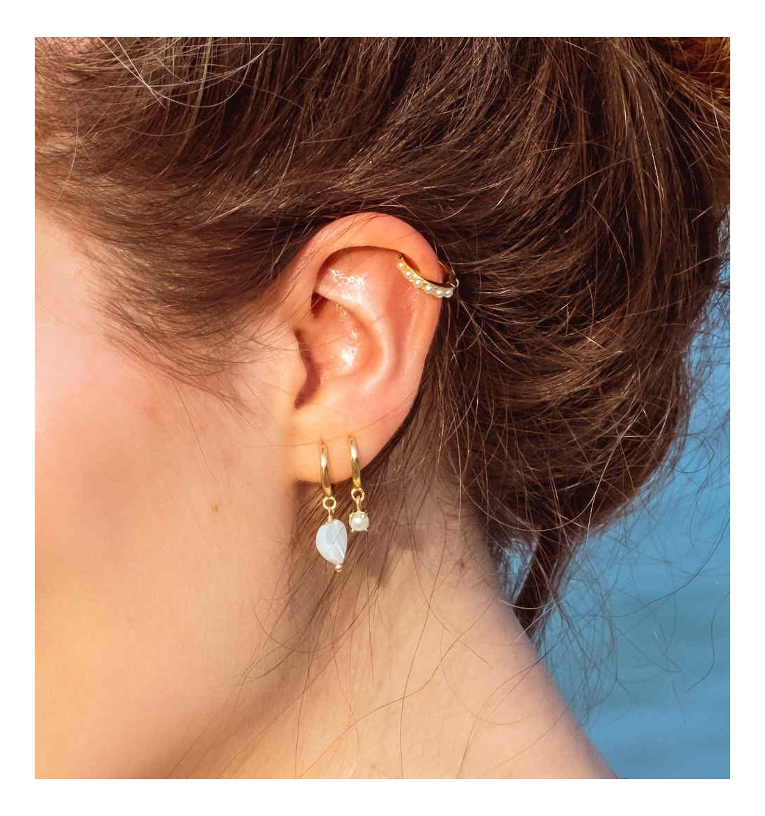 Last items in stock Earrings in gold SARIL PIERCING GOLD PE428DO From: €12.00 From: Sterling silver Moon ear piercing earring, gold-plated.. They are sold individually or in pairs. -Stone: pearl -Closure: thread -Measure: 3,5mm Add to cart