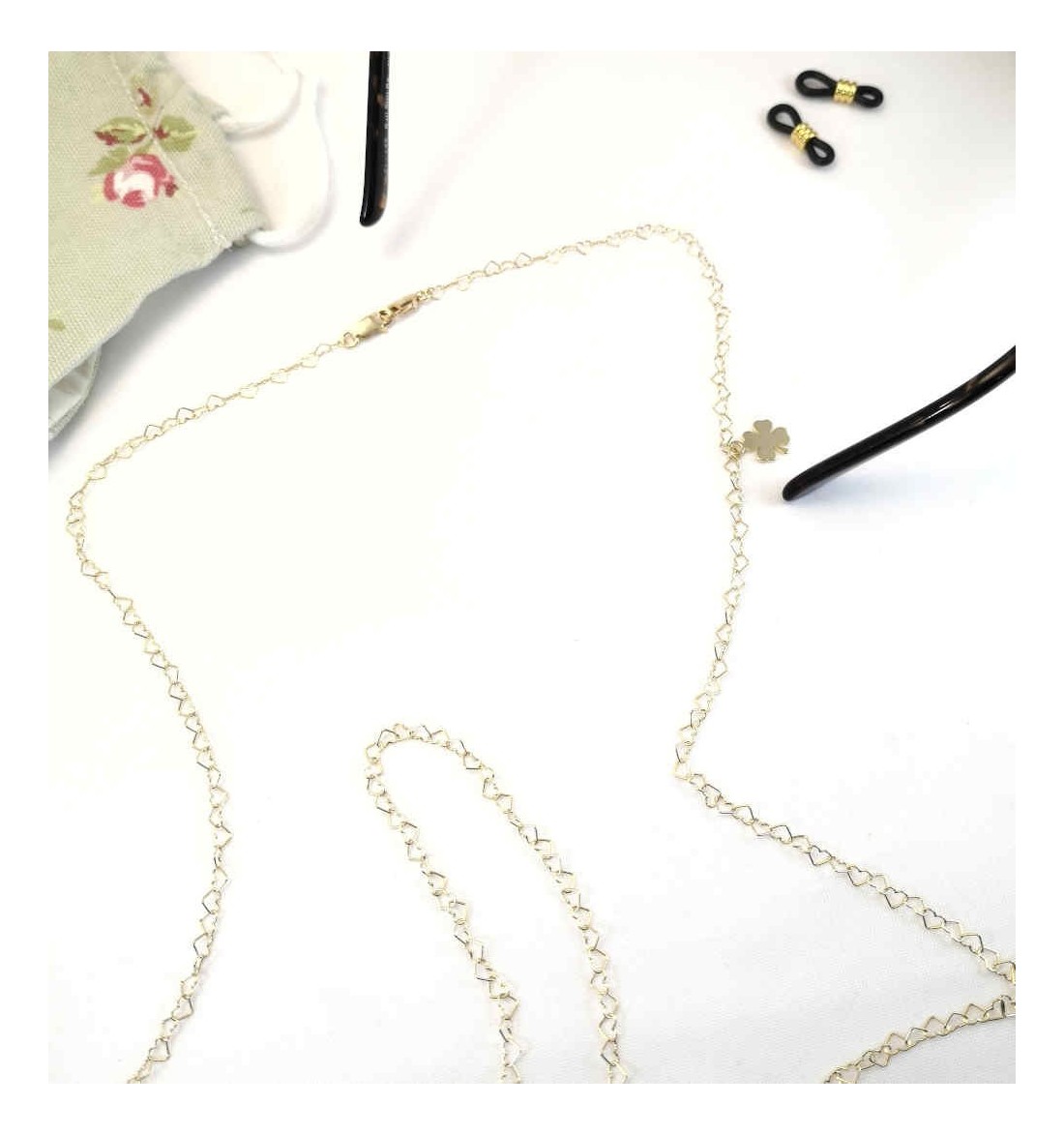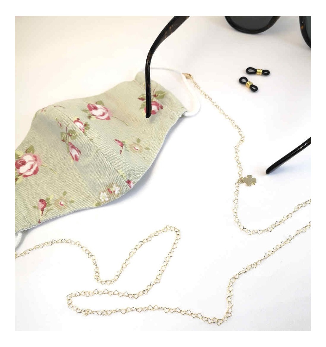 18k gold-plated sterling silver heart chain, with two carabiners to attach to the mask, which can also be used as a necklace clasp. It comes with two accessories to also convert it into a glasses hanger, made of gold-plated stainless steel and black rubber.