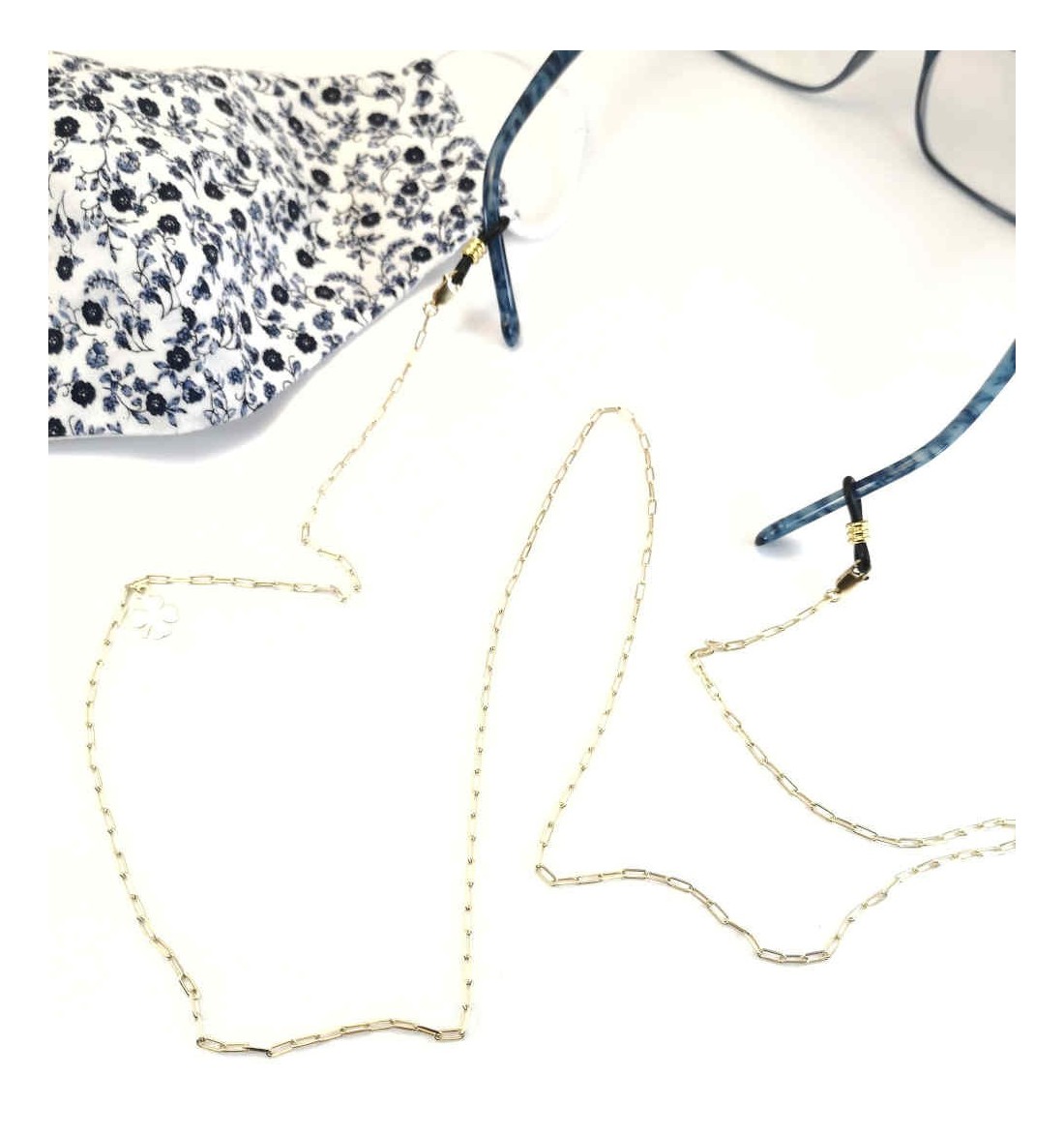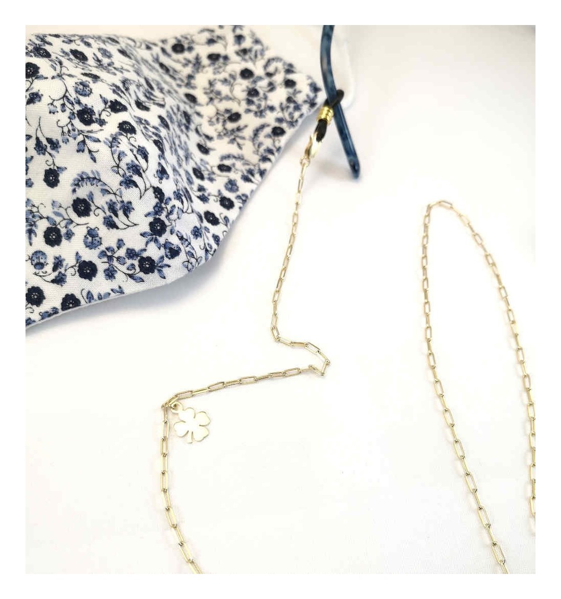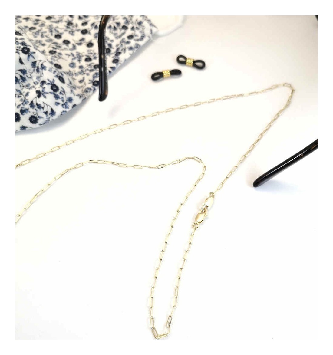 18k gold-plated sterling silver heart chain, with two carabiners to attach to the mask, which can also be used as a necklace clasp. It comes with two accessories to also convert it into a glasses hanger, made of gold-plated stainless steel and black rubber.