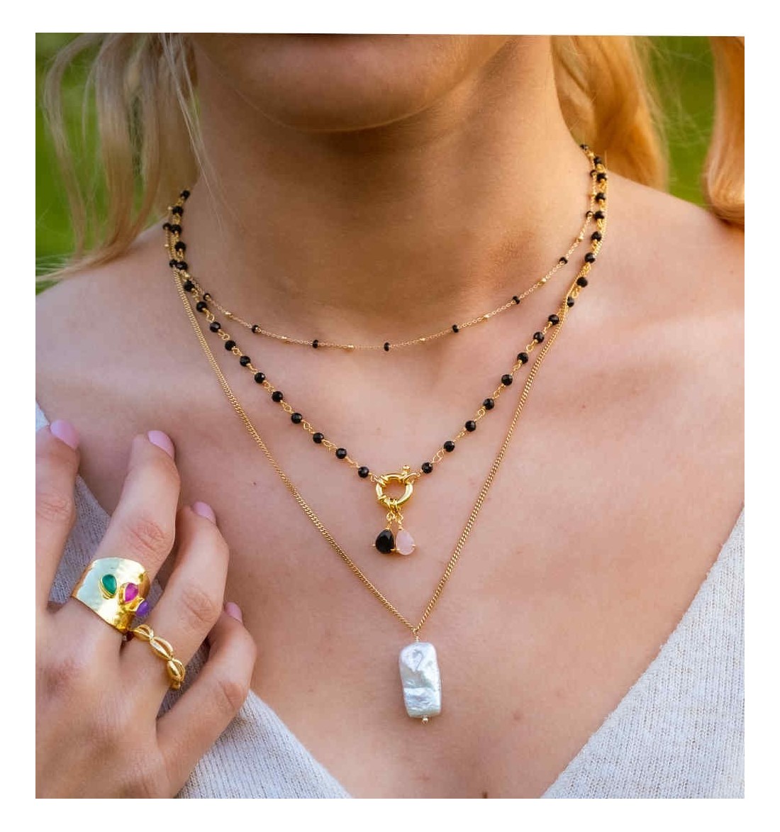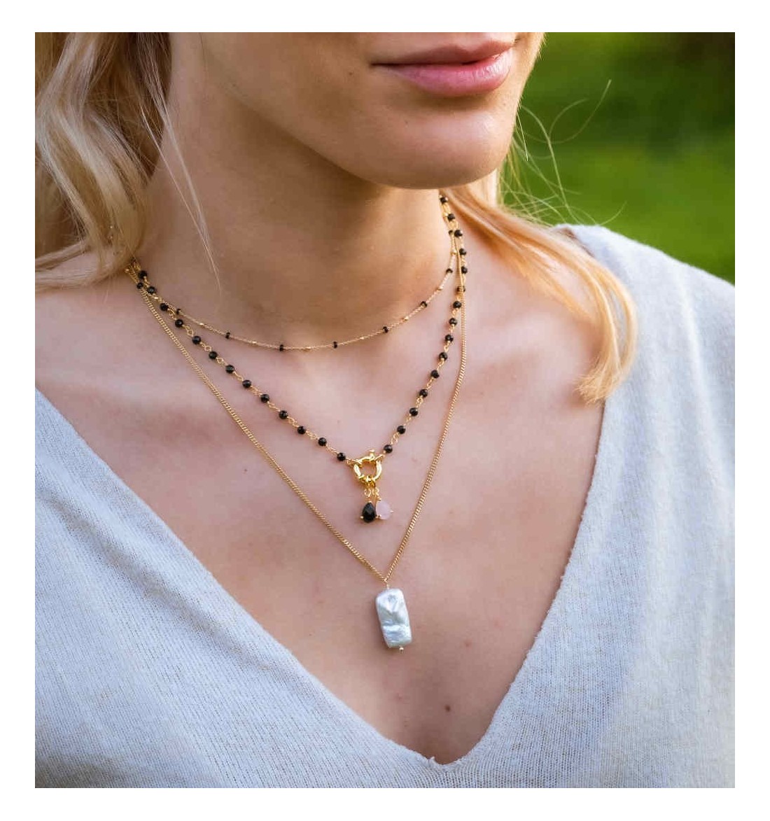 Last items in stock Necklaces in gold JAZMÍN GOLD CO227DO €40.00 -Necklace with natural pearl , made of 925 sterling silver,plated in 18 carat gold. -Chain: 36-44cm -Stone: Natural Pearl. Size pearl: 4,5-5mm Add to cart