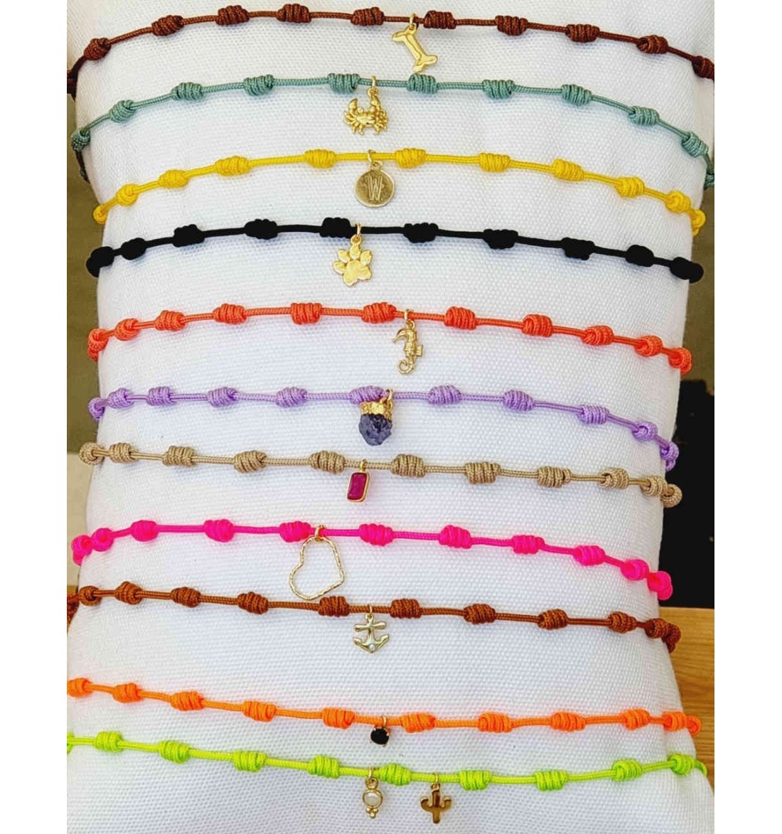 Collar de hilo, con 14 nudos, ideal para añadir charms, con cierre de mosquetón de plata con baño de oro y en diferentes colores.
