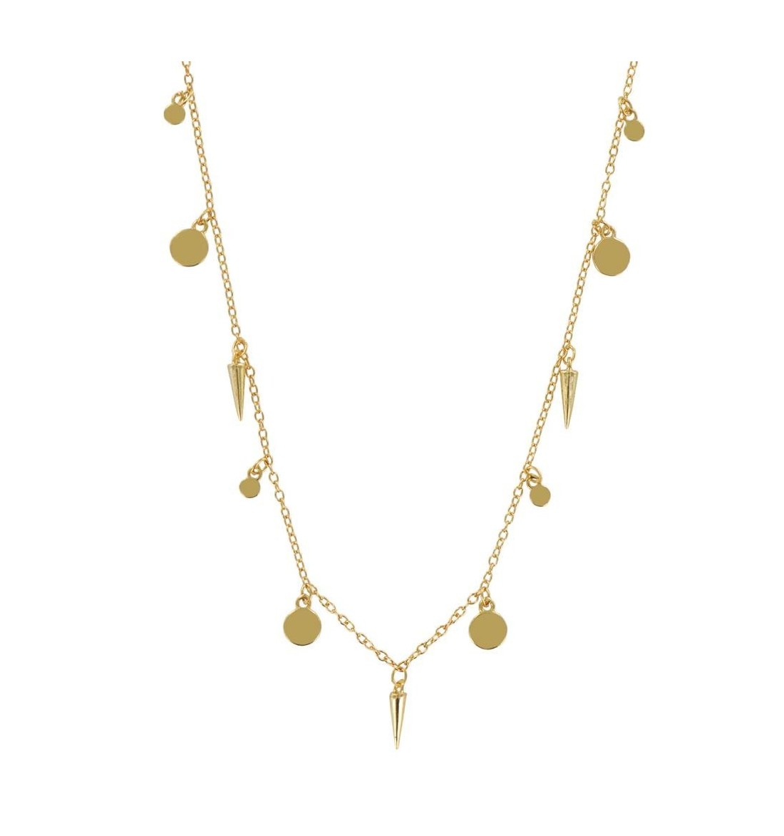 Collar con plaquitas minis, redondas y pinchos, de plata 925 y baño de oro. -