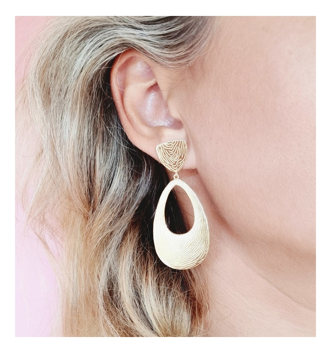 Pendiente largo, disponible en plata de primera ley, con baño de oro.
