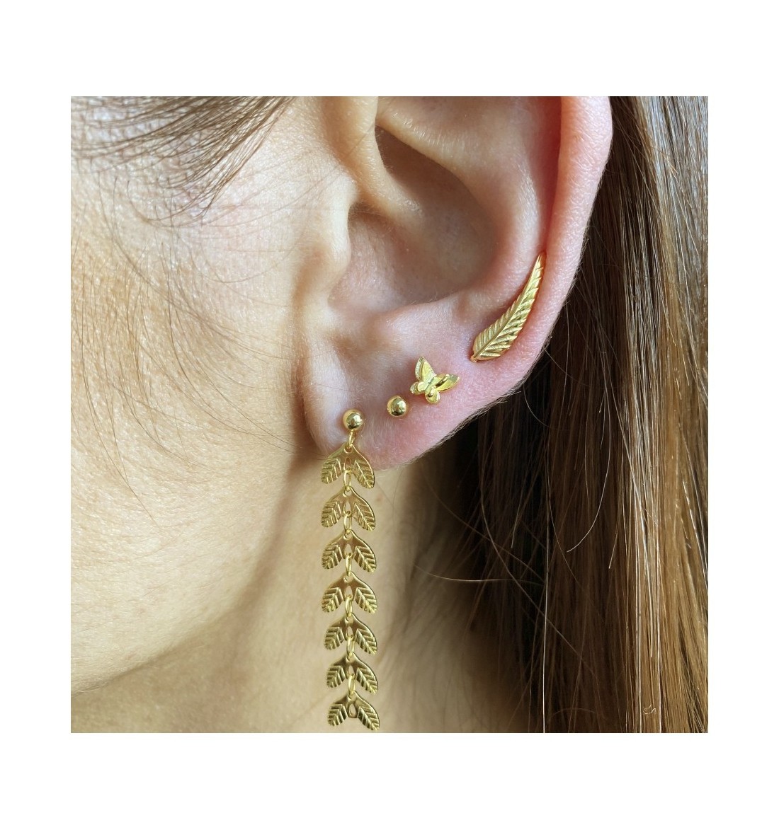 Pendiente largo, disponible en plata de primera ley, con baño de oro