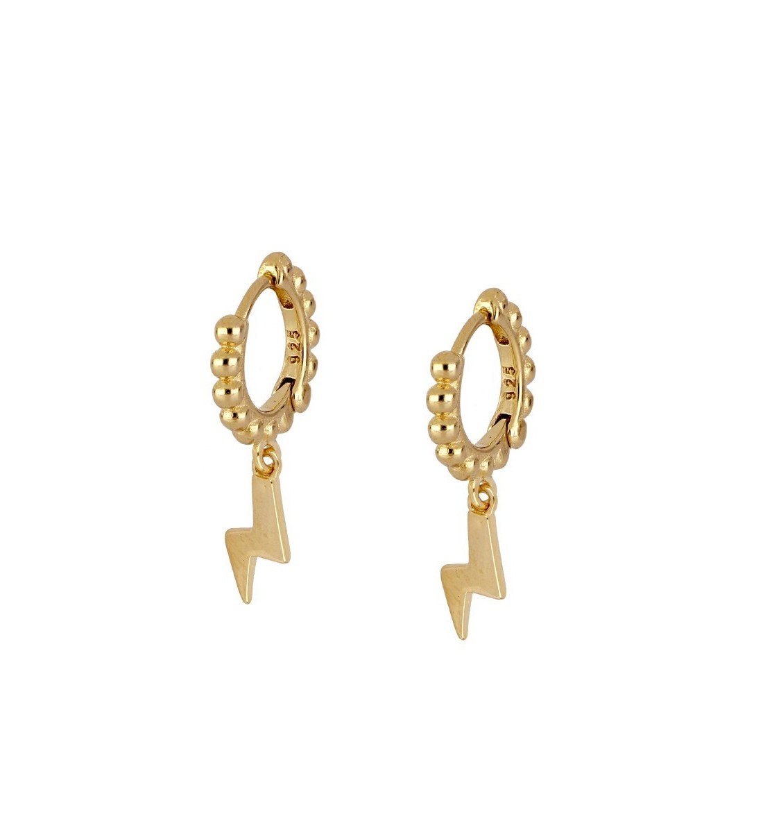 Pendiente aro con bolitas y rayo de plata 925, bañada en oro.
